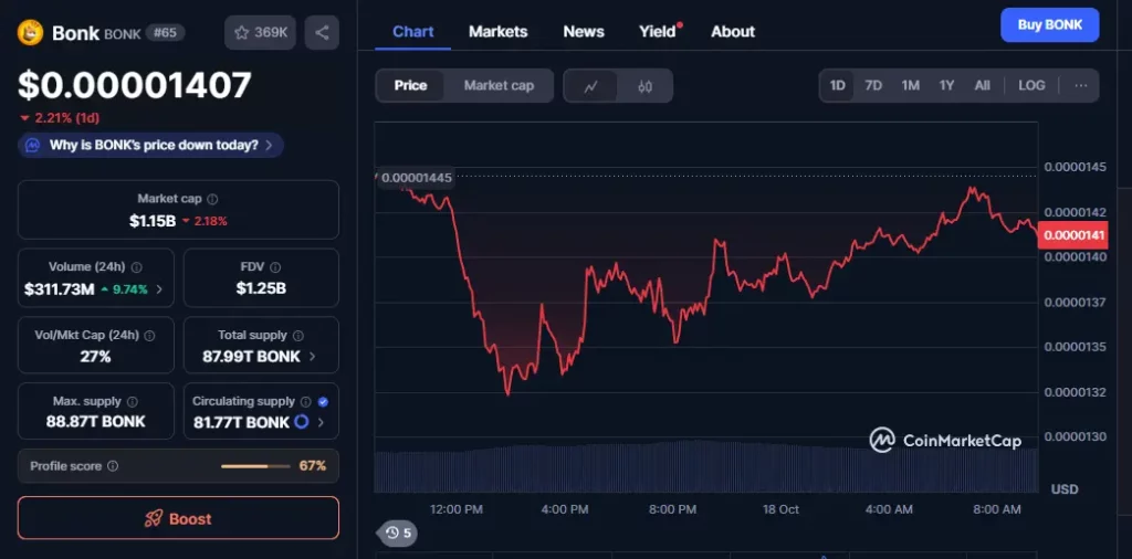 CoinMarketCap के अनुसार, फिलहाल यह $0.00001407 पर ट्रेड हो रहा है। पिछले 24 घंटों में इसकी प्राइस में 2.21% गिरावट देखने को मिली है। इसका मार्केट कैप $1.15B है। इसकी टोटल सप्लाई 87.99T BONK है। इससे समझा जा सकता है कि भले ही पिछले कुछ समय से इसके प्राइस में गिरावट आई हो लेकिन इस Memecoin में अब भी वापसी का पोटेंशियल है।