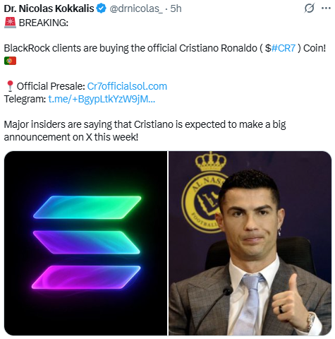अब तक क्रिस्टियानो ने इस तरह के किसी भी कॉइन का सपोर्ट नहीं किया है। न ही BlackRock ने ऐसा कोई एलान किया है। यह केवल सोशल मीडिया पर हाइप बनाकर लोगों को आकर्षित करने का तरीका निकला।